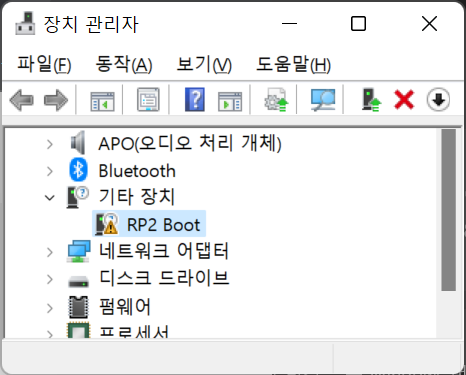 장치 관리자에 RP2 Boot로 경고가 표시됩니다. 혹은 알 수 없는 장치로 나타납니다.