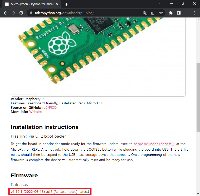 https://micropython.org/download/rp2-pico/ 에서 UF2 bootloader를 다운로드 받는다.